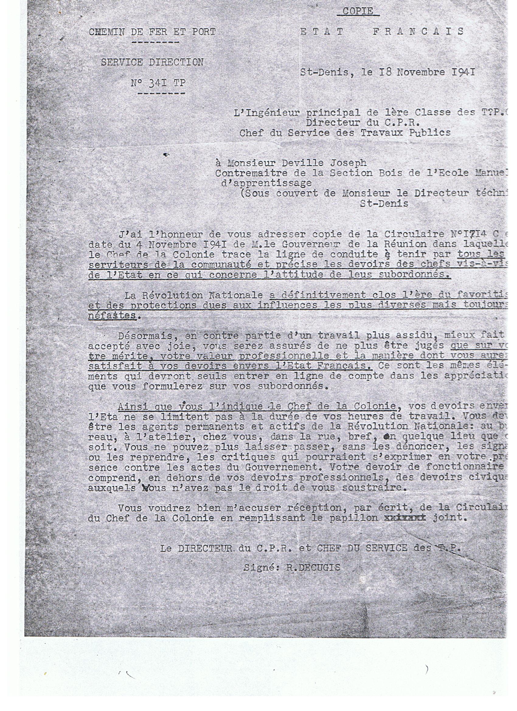 Véritable brevet de gaullisme, cette attestation insiste sur la nécessité qu’a connue Decugis de composer avec sa hiérarchie, de « pratiquer cette politique du moindre mal » consistant à répercuter les directives du gouverneur et de son chef de cabinet, au prix « des tourments toutes les fois qu’il fallait faire un acte qui pouvait être interprété comme l’acceptation d’un régime qu’il détestait »37. À sa décharge, on peut noter que, dans le courrier incriminé, Decugis se contente d’« adresser copie de la circulaire du 4 novembre 1941 de M. le Gouverneur de La Réunion », qu’il résume en sept phrases seulement (alors que la note de Aubert faisait deux pages) sur un ton neutre et sans aucun commentaire personnel, se bornant à demander à ses subordonnés de lui en accuser réception par écrit38.