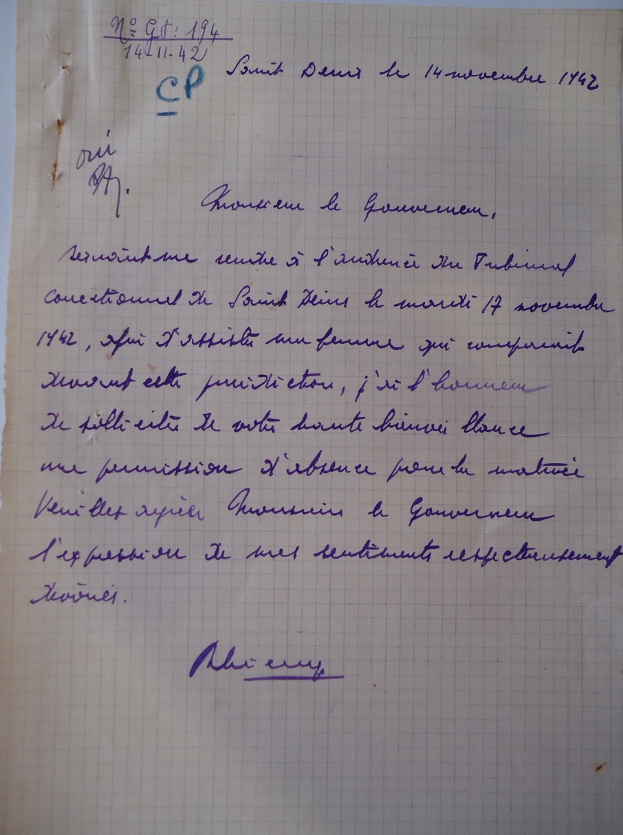 Loin de chercher à cacher l’engagement de son épouse, Raymond Decugis écrit à deux reprises au gouverneur pour solliciter une autorisation d’absence le 17 novembre de façon à se rendre « à l’audience du tribunal correctionnel de Saint-Denis afin d’assister [sa] femme qui comparait devant cette juridiction »13.