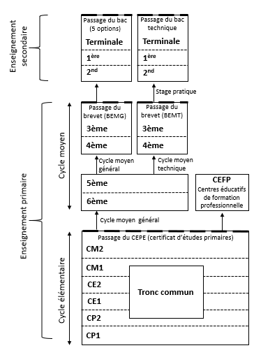 Comme on peut le voir sur l’organigramme ci-dessus7, le découpage des cycles entre le primaire et le secondaire ainsi que la division des filières entre générale, technique et professionnelle étaient calqués sur le système français. Cette subdivision était en faveur de la filière générale qui servait de référentiel à toutes les autres ; les filières techniques étant des choix de substitution surtout destinés aux élèves n’ayant pas le niveau nécessaire pour la filière principale. Le système scolaire congolais était ainsi très éloigné du monde professionnel. La première formation technique n’était accessible qu’à partir de la classe de 4e, soit neuf ans après le début de la scolarité obligatoire et le premier stage pratique n’était prévu qu’à la fin de la classe de 3e, après l’obtention du brevet d’études moyen technique (BEMT). La structuration du cycle d’études secondaires au lycée était encore calquée sur la filière générale en trois ans et il n’y avait ni césure ou stage pratique prévus pour les formations techniques. Cette hiérarchisation était également visible dans le nombre d’options prévues pour le baccalauréat général. Il y avait cinq choix possibles comme en France : A (littéraire), B (histoire-géo), C (mathématiques), D (physique-chimie) et T (scientifiques industriels), tandis qu’il n’y avait qu’un baccalauréat technique et un professionnel. La longueur des études et l’éloignement du monde professionnel ont conduit à une inadéquation entre les formations et les besoins réels du Congo indépendant. Comme l’explique Maïthé L’Hénoret :