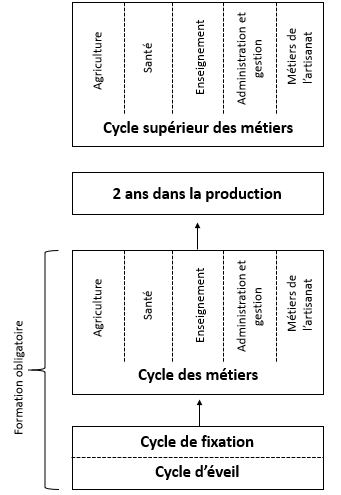Le projet de « l’école du peuple » s’est ainsi inscrit à l’opposé du modèle existant. D’après l’organigramme ci-dessous14, les militants de l’UGEEC ont voulu revoir totalement la structuration générale et les différentes étapes du parcours scolaire. L’enseignement était divisé en quatre cycles avec un tronc commun basé sur un cycle d’éveil et un cycle de fixation. Il s’agissait dans le premier d’un enseignement essentiellement oral et dans la langue maternelle des élèves pour éviter que les enfants commencent leur scolarité en français, dans une langue qu’ils ne maîtrisaient pas forcément. Le cycle des métiers était ensuite la grande nouveauté du système. Cette troisième étape était constituée de cinq écoles de métiers qui correspondaient aux secteurs clés de l’économie et aux besoins de la société congolaise. Il y avait l’école de l’agriculture, de la santé, de la formation des enseignants, de l’administration et de la gestion et de l’artisanat. D’après la proposition votée à l’issue du colloque, les objectifs étaient clairs : « détruire le mythe de l’intellectuel pur, ruiner le caractère sacré du fonctionnaire bureaucratique et mettre la culture scolaire en liaison étroite avec les travailleurs et la production15 ». Il s’agissait, en effet, de permettre aux élèves d’avoir des compétences en lien avec les besoins concrets de leur secteur et de s’insérer ainsi plus facilement ensuite dans le monde du travail ; et surtout de répartir plus équitablement les élèves dans les différents domaines pour éviter l’engorgement des filières administratives.