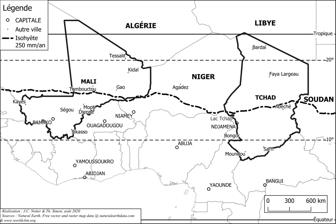Pour ces deux pays, un concept ancien mais récurrent est significativement apparu dès les premières années de la colonisation : le « Tchad utile » et le « Mali utile », comme s’il existait de fait une autre scission spatiale qui signerait in fine une partition territoriale. On comprend aisément que dans les deux pays, l’espace « utile » est méridional. C’est évidemment celui des terres arables du sud, des rivières et des fleuves, de l’eau parfois saisonnièrement surabondante, de la végétation, prairies et forêts, mais aussi, ces ressources méritant d’être utilisées, celui des villages, des bourgs ruraux, des petits centres urbains, des fortes densités de peuplement. A contrario, les espaces sahariens du nord offrent évidemment des ressources bien plus limitées, et d’autant plus précieuses, à une population très peu nombreuse. On recense (dans les derniers recensements réalisés entre 2009 et 2012) 500 000 Touaregs au Mali, 380 000 nomades de différentes ethnies au Tchad, soit moins de 3 % de la population. Ces espaces de « l’inutile », du « vide désertique », sont malgré tout habités, parcourus sans relâche. Mais ils ont été placés ou plutôt rejetés (et continuent à l’être) dans une forme de marginalité, évidemment très problématique pour la cohésion et la stabilité des deux États.
