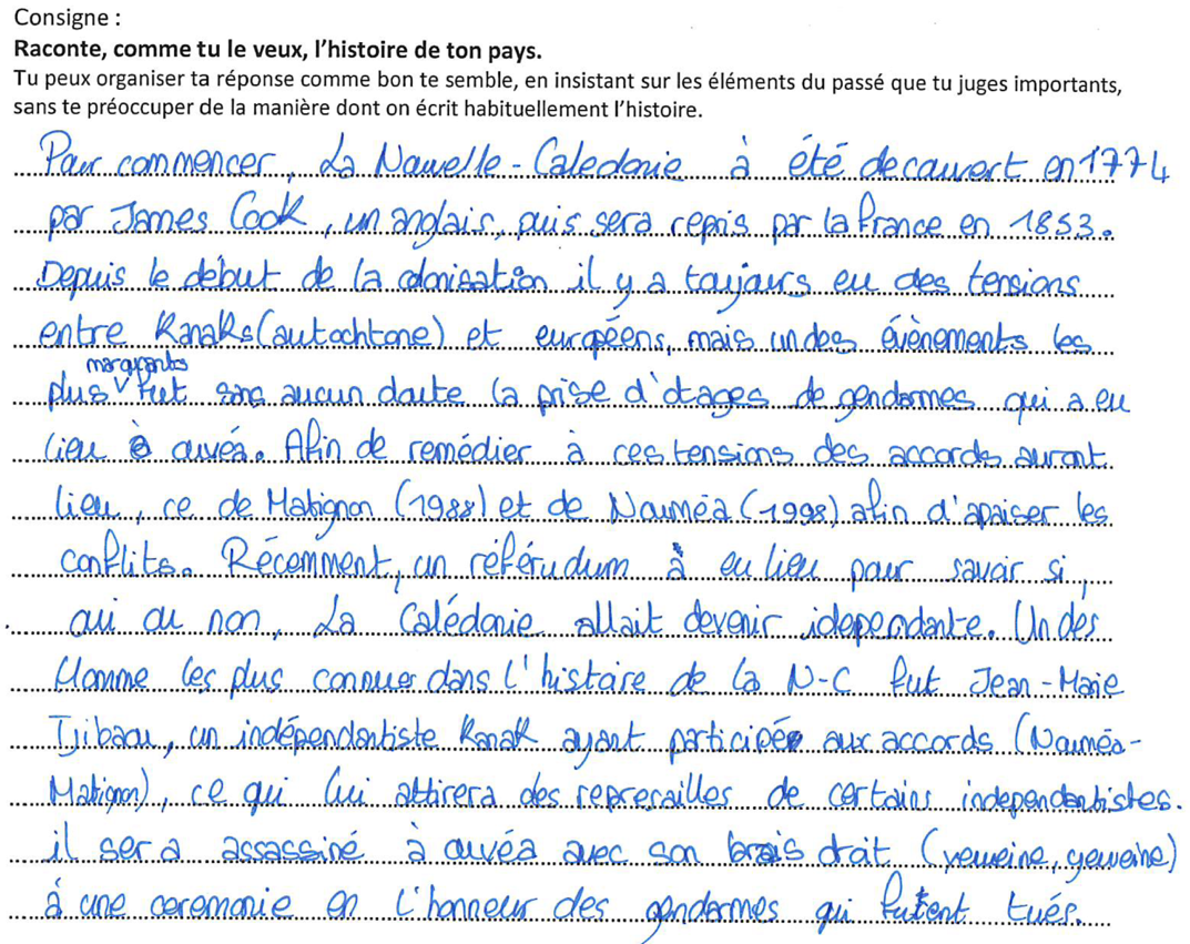 Figure 3 : Récit écrit par un élève de Première du lycée Lapérouse (Nouméa), s’identifiant Kanak