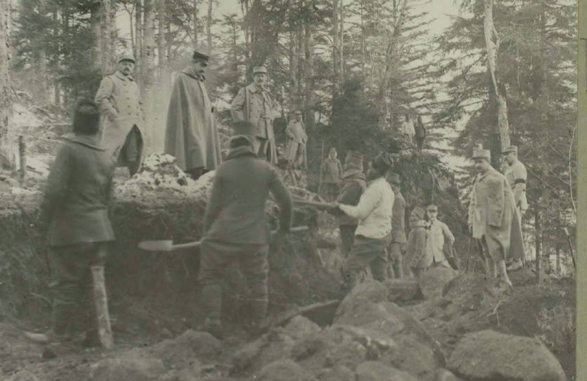 Beaucoup d’hommes sont employés aux travaux de construction. Les fonds iconographiques de la Bibliothèque de Documentation Internationale Contemporaine et de la Médiathèque de la Défense renferment une trentaine de clichés montrant ces hommes en train de bâtir une route dans la neige du ballon d’Alsace en 1917