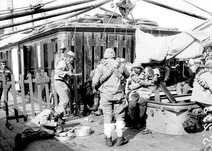 Des tirailleurs malgaches, à bord de l’Océanien, rejoignent Port-Saïd en faisant escale à Malte. Les soldats et les autres passagers sont équipés de ceintures de sauvetage