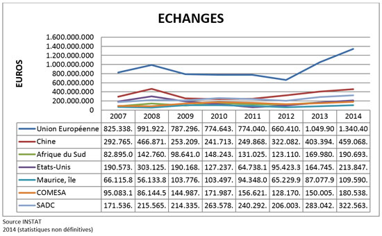 Entre 2007 et 2014, l’Union européenne restera le premier partenaire commercial de Madagascar. 36 % des échanges se faisaient avec l’UE en 2007 contre 33 % en 2014. 13 % des échanges se font avec la Chine en 2007 contre 11 % en 2014. La Chine devient le deuxième partenaire commercial de Madagascar à partir de 2005, remplaçant ainsi les États-Unis.