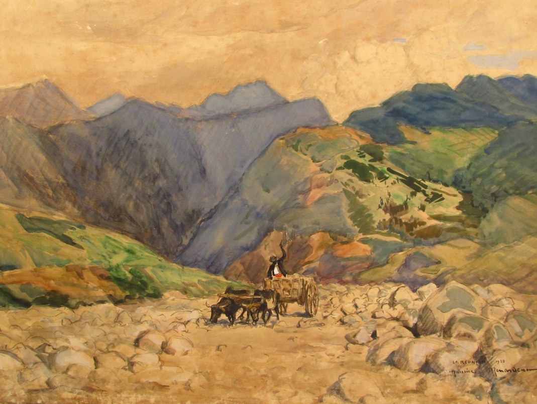 Ménardeau exposera le tableau à Paris au Salon des Indépendants en 1933 en même temps que trois autres toiles représentant les « Environs de Saint-Denis », « La Plaine des Cafres » et « Le Champs de Gillot », le tout nouveau champ d’aviation, comme on disait alors20. Lors de son second séjour, en 1935-1936, il ramène avec lui cette toile de « La Rivière-des-Galets » qui connaît un grand succès à l’exposition de Saint-Denis, le 17 juillet 1935. Le chroniqueur dionysien de Notre Pays cite la « tragique beauté de ce pays né de la lutte du vent et de la pluie sur les énormes projections du volcan initial »21. Si nous ne possédons plus la toile finale, en revanche, l’aquarelle de Port-Louis en est bien le premier jet : dans ce sentier étroit où a dévalé un amas d’énormes galets, un homme et son équipage de bœufs peinent à se frayer un chemin. En lui attribuant ce titre de « La Réunion » (écrit et daté avec sa signature), Ménardeau, lors de ce premier séjour, a bien compris et désiré montrer la lutte de l’homme sur cette terre difficile.