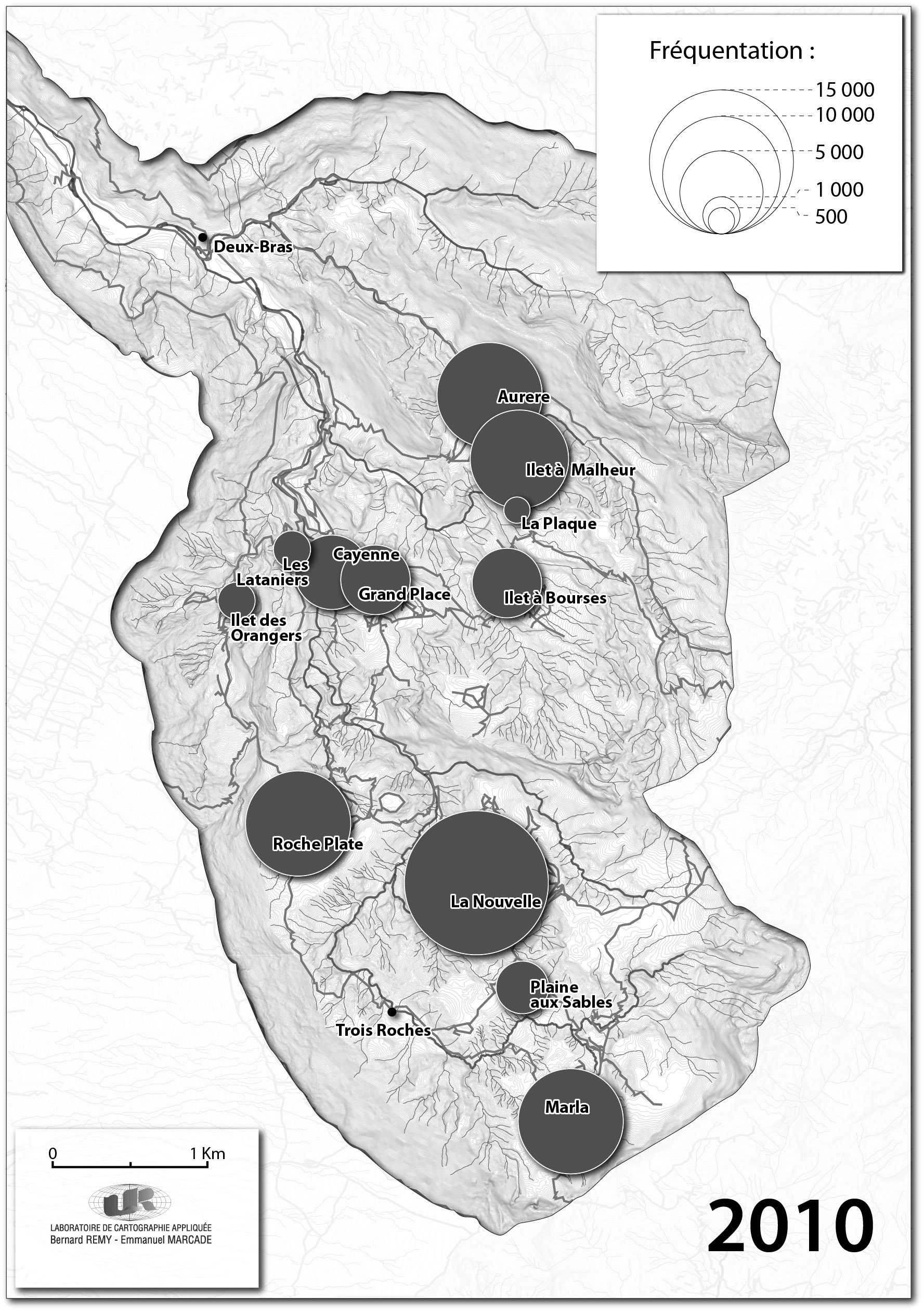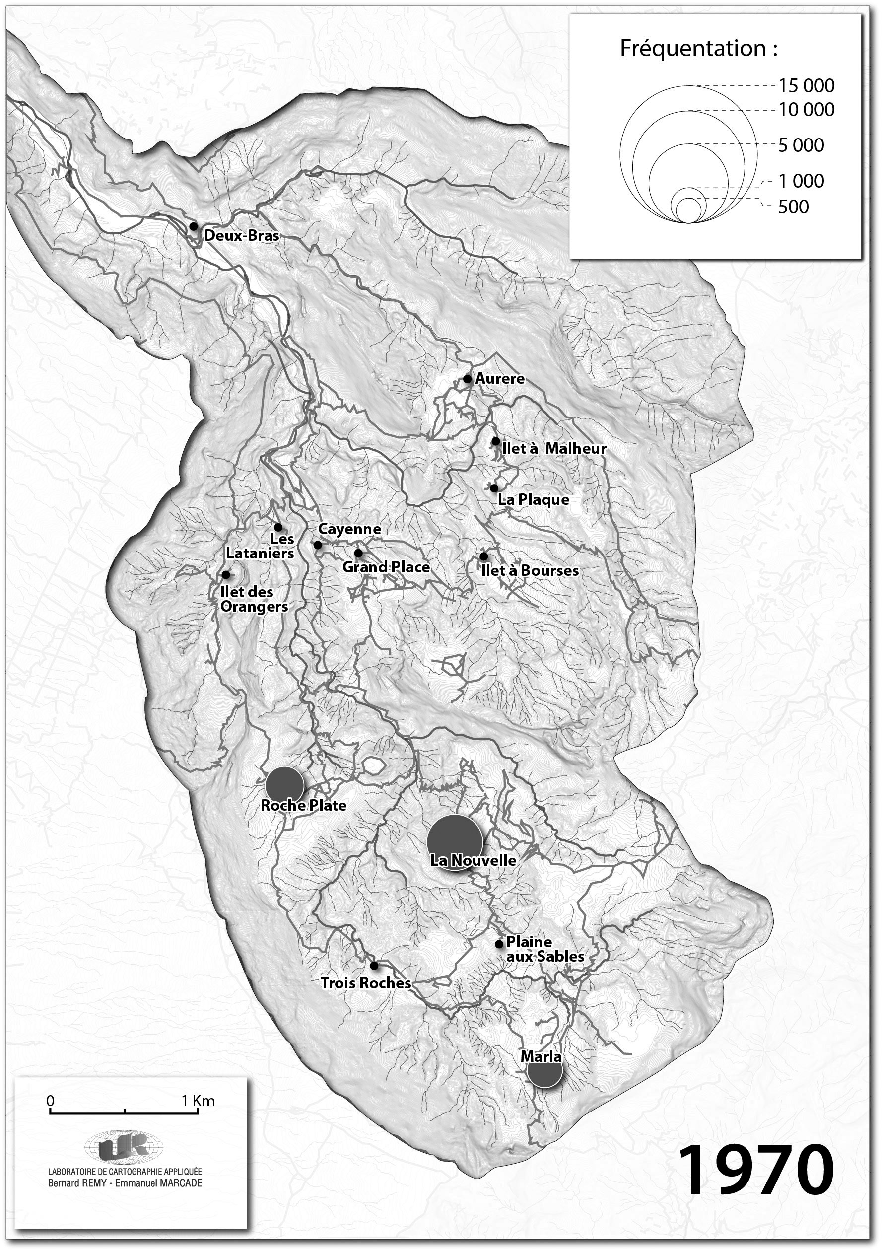 Quelques données sur les infrastructures et la fréquentation touristique (diverses et pas toujours concordantes, issues des services touristiques régionaux et communaux ou de la structure fédérative de la « maison de la montagne ») et consolidées tant bien que mal permettent de mieux saisir le renversement vécu par cet espace. Les deux cartes (figures 3 & 4) de localisation des gîtes et structures d’accueil à vocation touristiques (bars et petites boutiques associées notamment) montrent assez clairement que le tournant se situe durant la décennie 70. Les infrastructures, jusqu’alors « cantonnées » au sud du cirque dans les îlets les plus rapidement accessibles (La Nouvelle, Marla, Roche Plate), couvrent désormais l’ensemble du cirque : aucun îlet ne reste désormais à l’écart de la « manne touristique » et, contrairement à une idée reçue, La Nouvelle n’est plus le « pôle » touristique essentiel de Mafate. Cette évolution va très certainement conduire certains à Mafatais à franchir une étape supplémentaire et qui pourrait être décisive. De jeunes Mafatais commencent très clairement à évoquer l’idée de réoccuper certains îlets abandonnés, parfois situés dans les sites exceptionnels et très isolés, comme ceci a été déjà évoqué dans un travail récent :